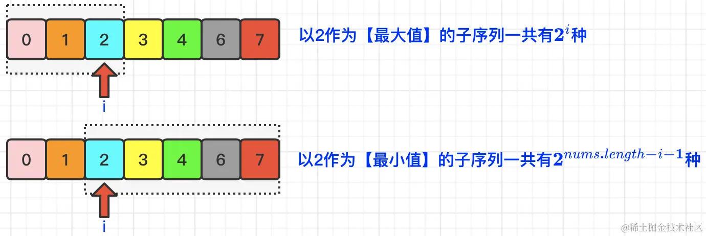那么,针对于nums[i]来说,它的宽度总和就是: (2i-2nums.length-i-1) * nums[i] ,那么我们遍历所有nums数组中的元素,逐一计算每个元素的宽度总和,那么最终结果就是本题的答案。
