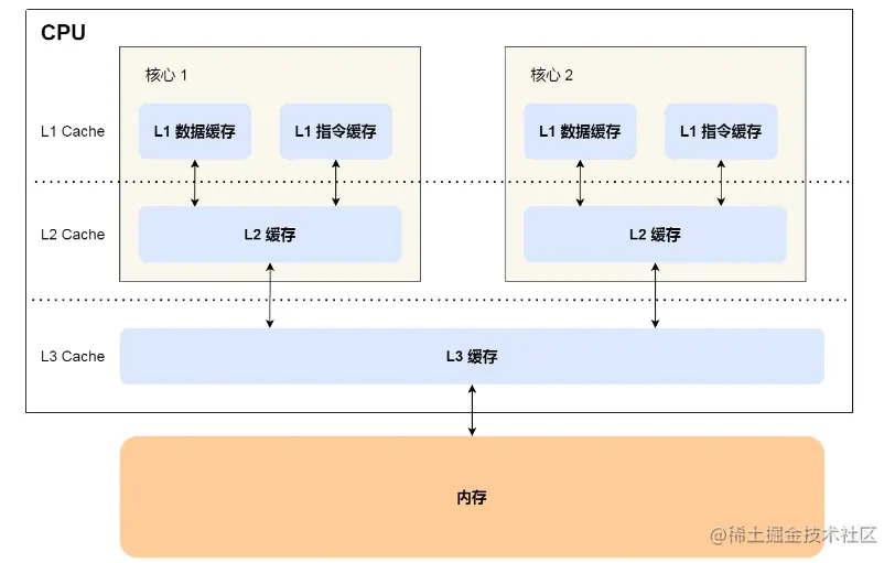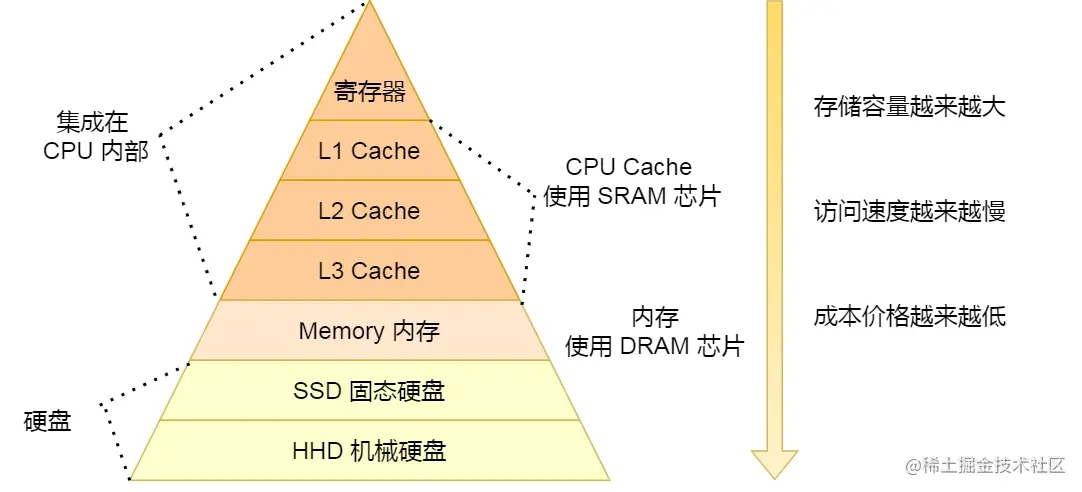 当 CPU 需要访问内存中某个数据的时候,如果寄存器有这个数据,CPU 就直接从寄存器取数据即可,如果寄存器没有这个数据,CPU 就会查询 L1 高速缓存,如果 L1 没有,则查询 L2 高速缓存,L2 还是没有的话就查询 L3 高速缓存,L3 依然没有的话,才去内存中取数据,不同的存储器之间性能差距很大,构造存储器分级很有意义,分级的目的是要构造缓存体系