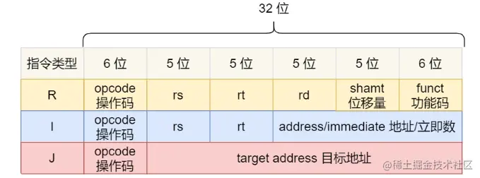 以MIPS 指令集为例,MIPS 的指令是一个 32 位的整数,高 6 位代表着操作码,表示这条指令是一条什么样的指令,剩下的 26 位不同指令类型所表示的内容也就不相同,主要有三种类型R、I 和 J。