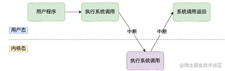 内核程序执行在内核态,用户程序执行在用户态。当应用程序使用系统调用时,会产生一个中断。发生中断后, CPU 会中断当前在执行的用户程序,转而跳转到中断处理程序,也就是开始执行内核程序。内核处理完后,主动触发中断,把 CPU 执行权限交回给用户程序,回到用户态继续工作。