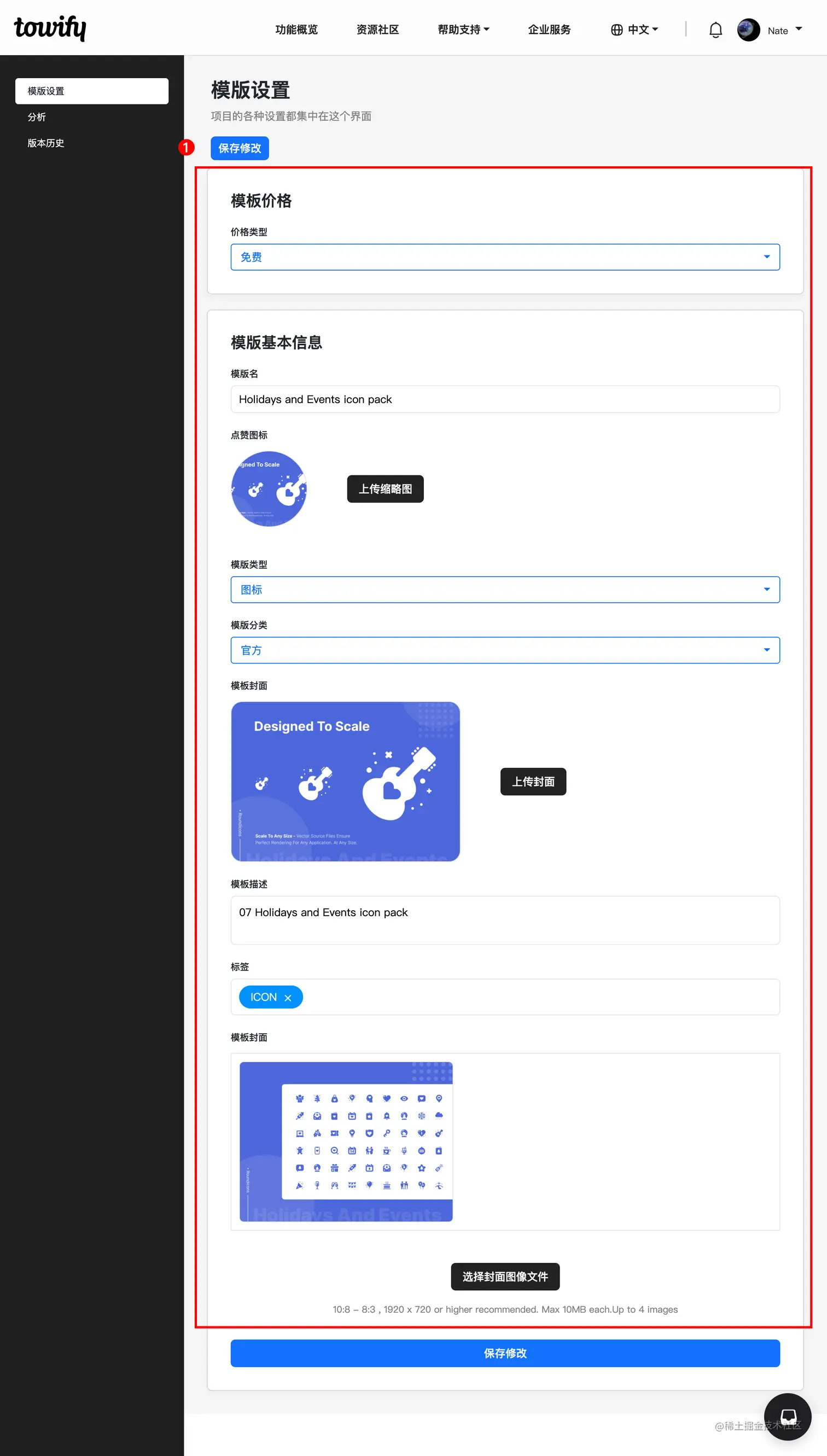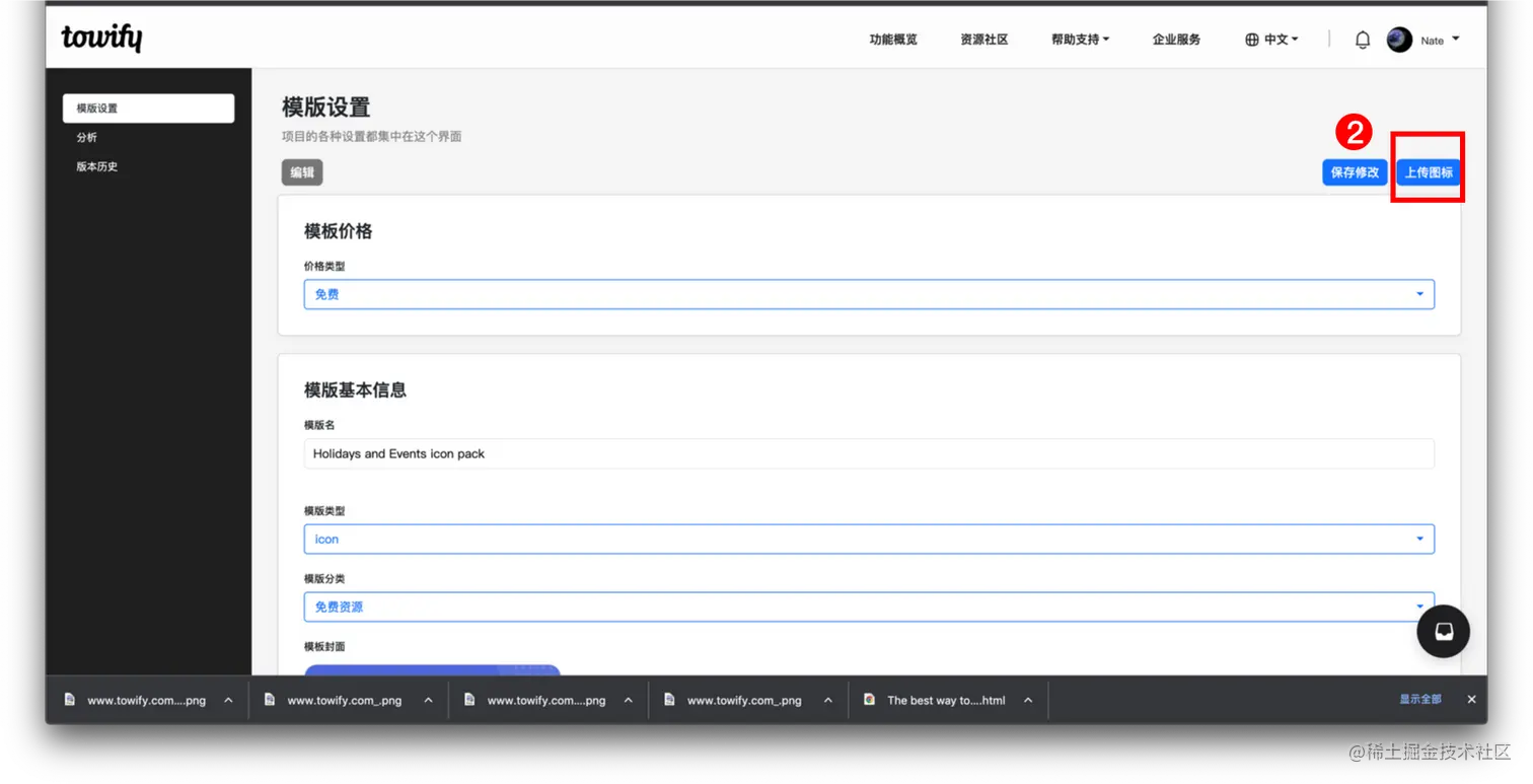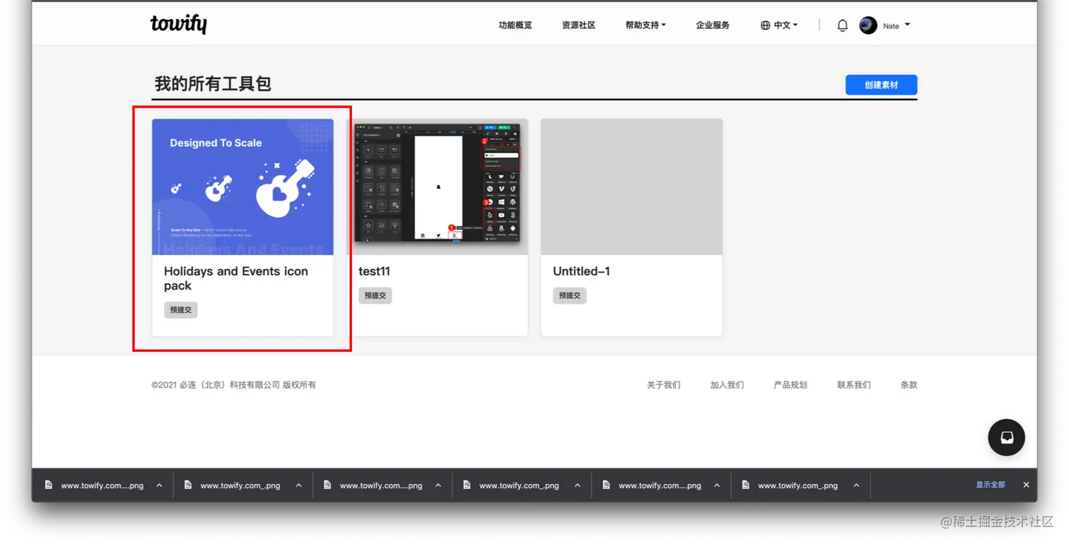如何在资源社区上传图标素材 TOWIFY 2022-11-18 129 阅读1分钟 前置准备: Icon、封面图等素材 具体步骤: 进入创作者中心页面 填写图标Icon相关项目信息 等待审核 步骤分解: 进入创作者中心页面 登陆进入官网 点击个人— 创作者中心 页面 点击右上角 创建素材 填写图标Icon相关项目信息 按照个人需求填写 模版设置 信息 保存修改 后,点击右上角 上传图标 填写 图标 相关信息,点击 保存修改 等待审核 上传成功后,等待官方审核即可