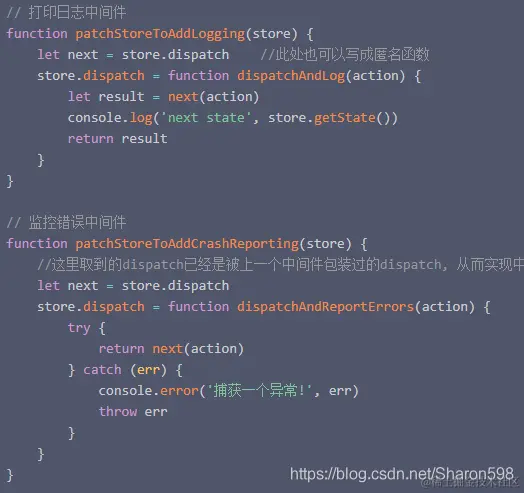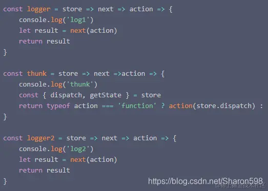 把不同的功能的模块拆分成不同的方法,在方法内,获取上一个中间件包装过的store.dispatch实现链式调用,然后通过调用这些中间件方法,分别使用、组合这些中间件