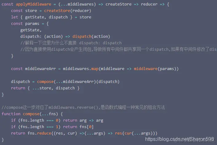 但因为在函数内修改了store的dispatch,产生了副作用,所以,把applayMiddleware作为高阶函数,增强store,而不是替换dispatch