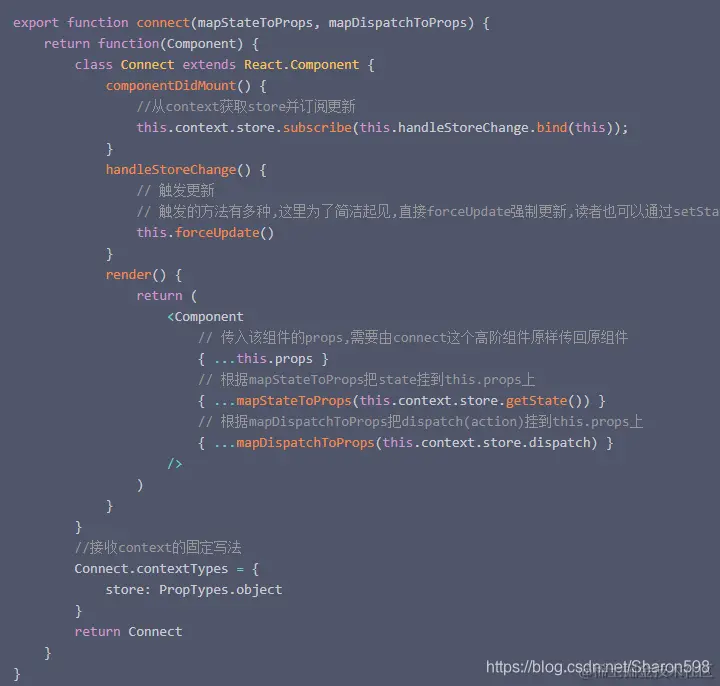 connect接收mapStateToProps、mapDispatchToProps两个方法,然后返回一个高阶函数,这个高阶函数接收一个组件,返回一个高阶组件(其实就是给传入的组件添加一个写属性和功能),将state和dispatch(action)挂载在子组件的props上