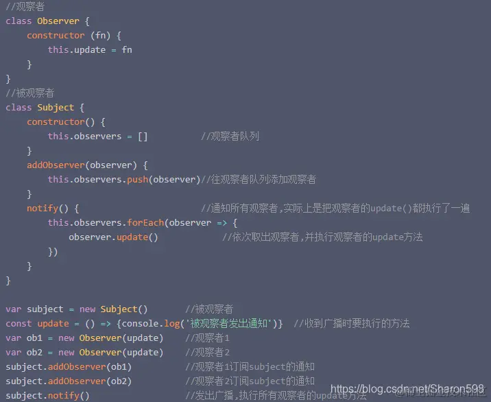 先用正常想法思考一下,需要每个观察者都有一个update方法,当被观察者发出通知后,执行update方法;被观察者拥有addObserver(添加观察者,将所有观察者的update放在一个队列里)和notify方法,当notify执行的时候,从队列中取出所有观察者的update方法并执行,就实现了通知的行为。