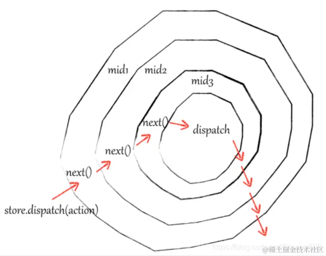 (...arg) => mid3(mid1(mid2(...arg)))这种形式