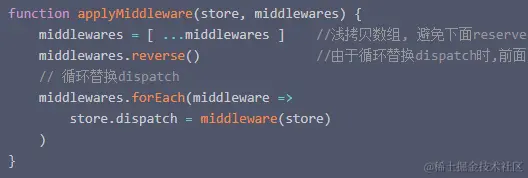添加中间件,(由于循环替换dispatch时,前面的中间件在最里面,所以需要数组翻转,才能保证中间件的调用顺序)