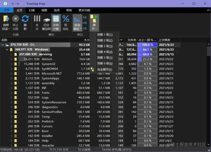电脑用久了会有这样的错觉:我的电脑里似乎只有一点点东西占着硬盘,实际上的一点点是这样的,这时候就要隆重请出我们的 TreeSize 啦!它也同样是一款强大又轻量的软件,它可以帮你扫描出电脑所有文件和它们的占存大小,也能以图形的方式可视化展现出来。TreeSize 的扫描速度还是很快的喔,并且展示的文件信息也很全面,除了文件大小之外,还能看到所属的文件夹数量、修改时间、分配大小等等内容。