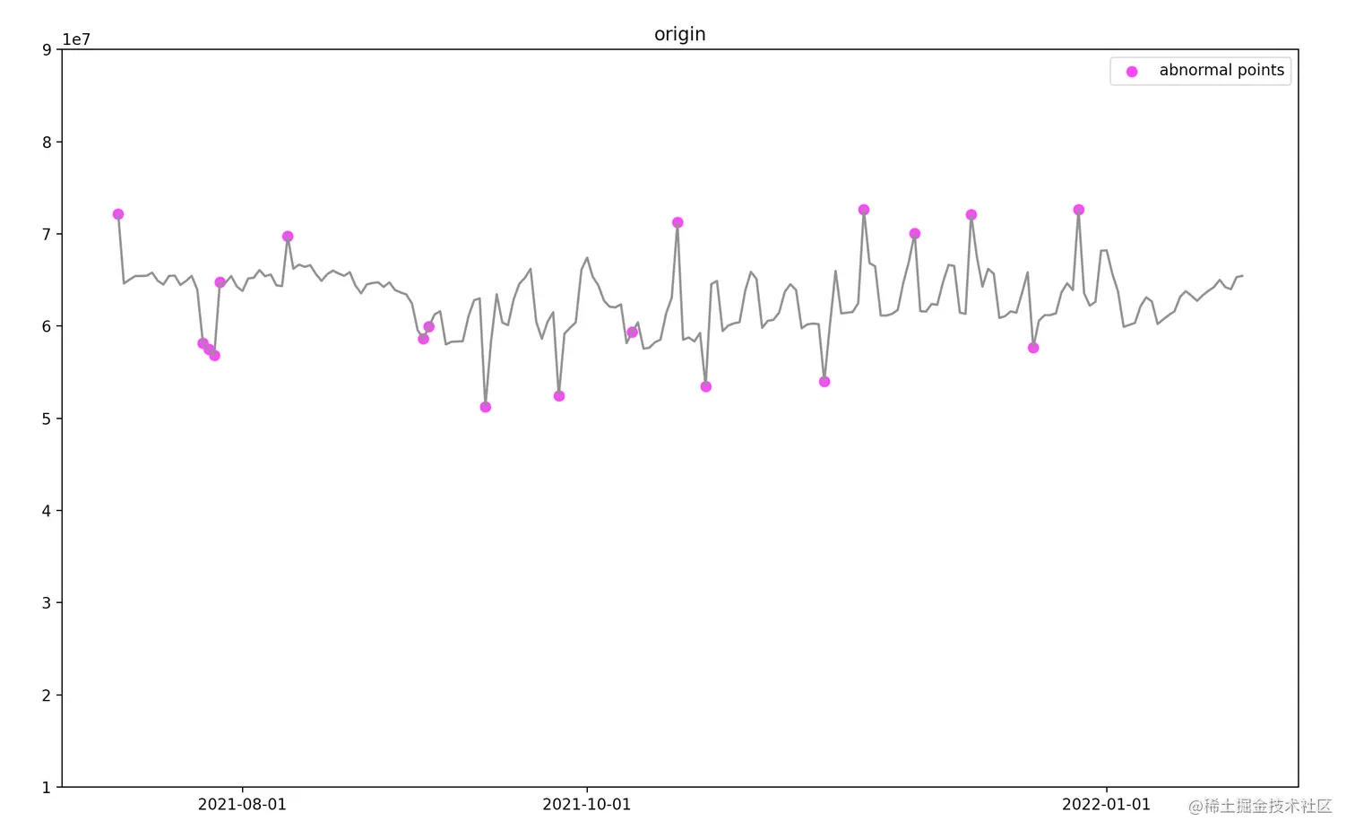 200个原始数据,其中异常点个数为19个。指标趋势如下,其中标注圆点为异常点。