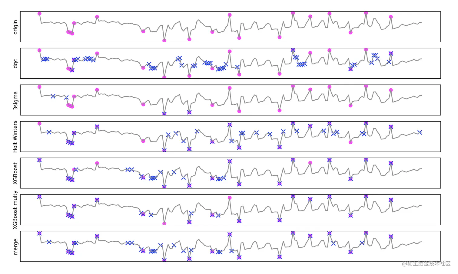 XGBoost算法的表现明显优于dqc、Holt Winters等算法,能找出最多的异常点并且错报最少。