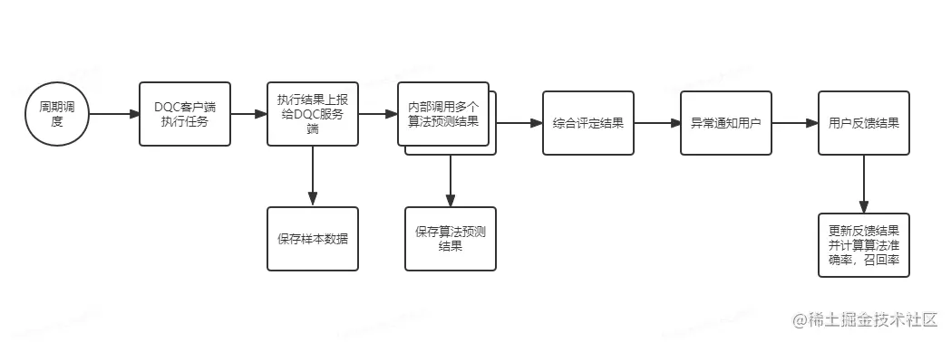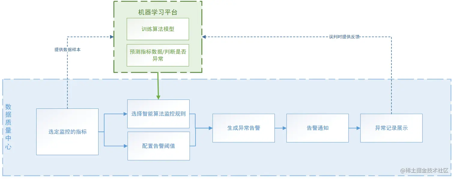 拓展“数据质量中心”功能,在DQC监控功能的基础上,接入机器学习平台。功能流程如下:
