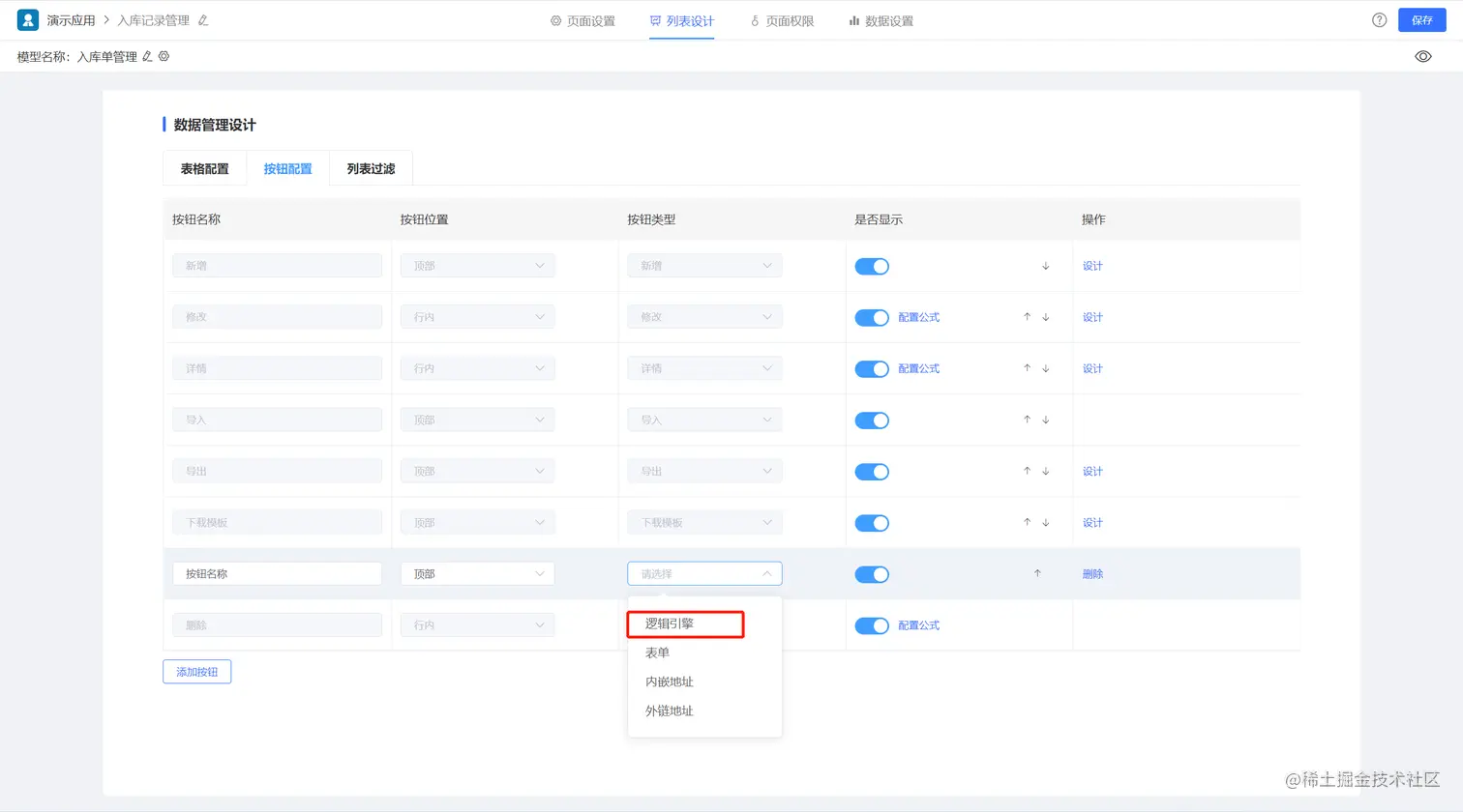 列表页的按钮是可以触发逻辑的,选择逻辑后,点击设计,即可进入业务逻辑的配置。这种场景下,常常用于对列表页的数据处理。
