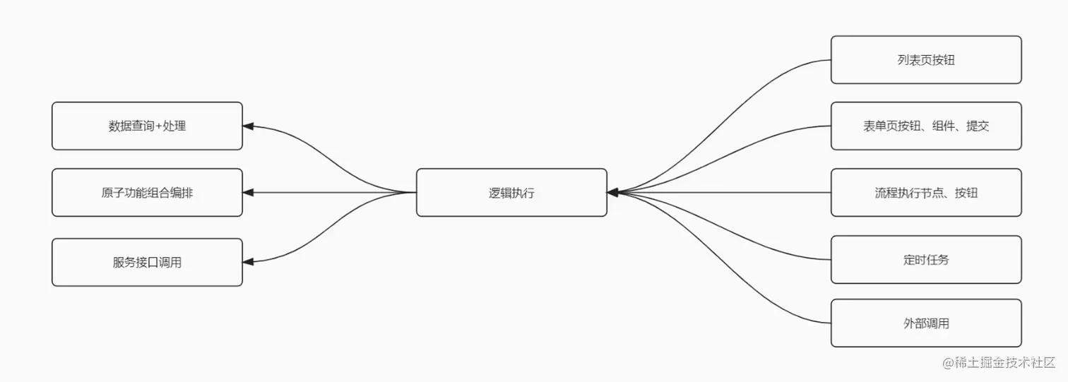 逻辑执行可以触发数据的查询、加工、处理,可以将系统内置的原子功能拼装组合,调用服务接口(内部/外部)等,并且提供众多的调用入口。
