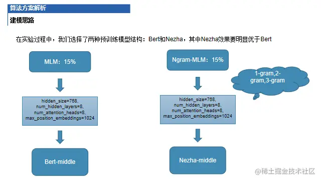 - 预训练任务 在实验过程中,我们选择了两种预训练模型结构:Bert和Nezha,其中Nezha效果要明显优于Bert
