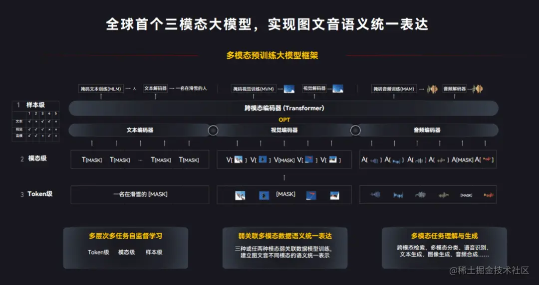 “紫东.太初”所瞄准的,正是常规大模型的局限性:通过将图像、文本、语音等不同模态数据实现跨模态的统一表征和学习,完成了从“一专一能”到“多专多能”的跨越,不仅可以实现跨模态理解,还能实现跨模态生成,做到了理解和生成两个最重要的认知能力的平衡,并首次实现了以图生音、以音来生图的功能。