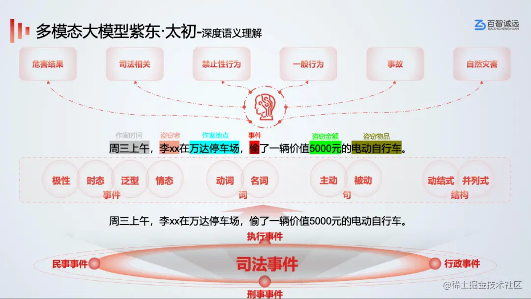 以深度语义理解为例,输入“周三上午,李XX在万达停车场,偷了一辆价值5000元的电动自行车”,“紫东.太初”可以自动识别出作案时间、盗窃者、作案地点、盗窃金额、盗窃物品等有效信息,并对事件性质、危害结果、相关司法案例等进行联想,形成了综合性的知识结构。