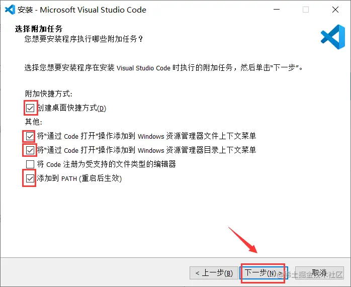 不勾选将code注册为受支持的文件类型的编辑器,如果勾选了就是使用VScode作为默认文件编辑器。