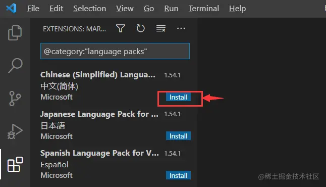 在软件左侧出现插件扩展面板,选择Chinese(Simplified) Language,点击“Install”按钮