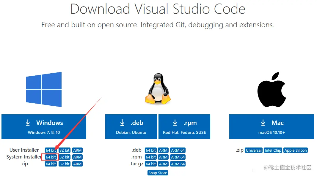 VS Code下载地址:code.visualstudio.com/,VS Code有User Installer、System Installer和zip三种版本。