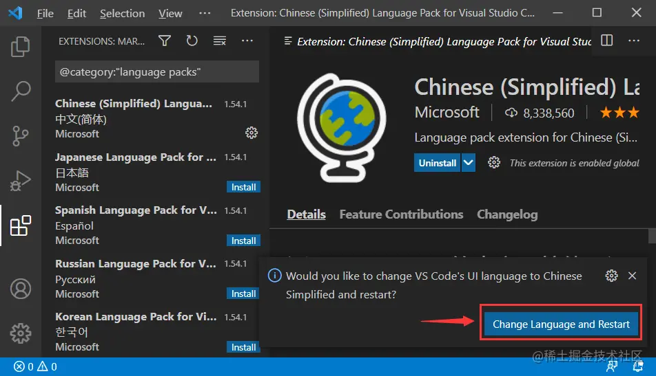 重启Visual Studio Code, Visual Studio Code界面显示语言从英文变成中文。