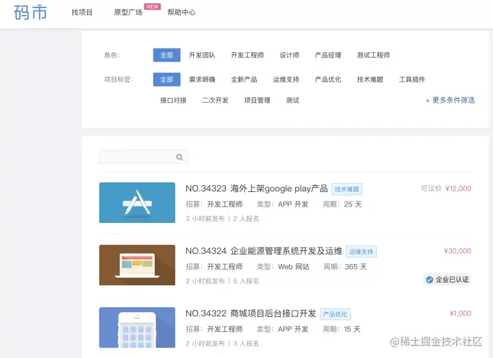 程序员可以接单的私活有网站开发、APP开发、公众号开发等,有原型广场可提供素材,支持驻场开发相关的招聘。