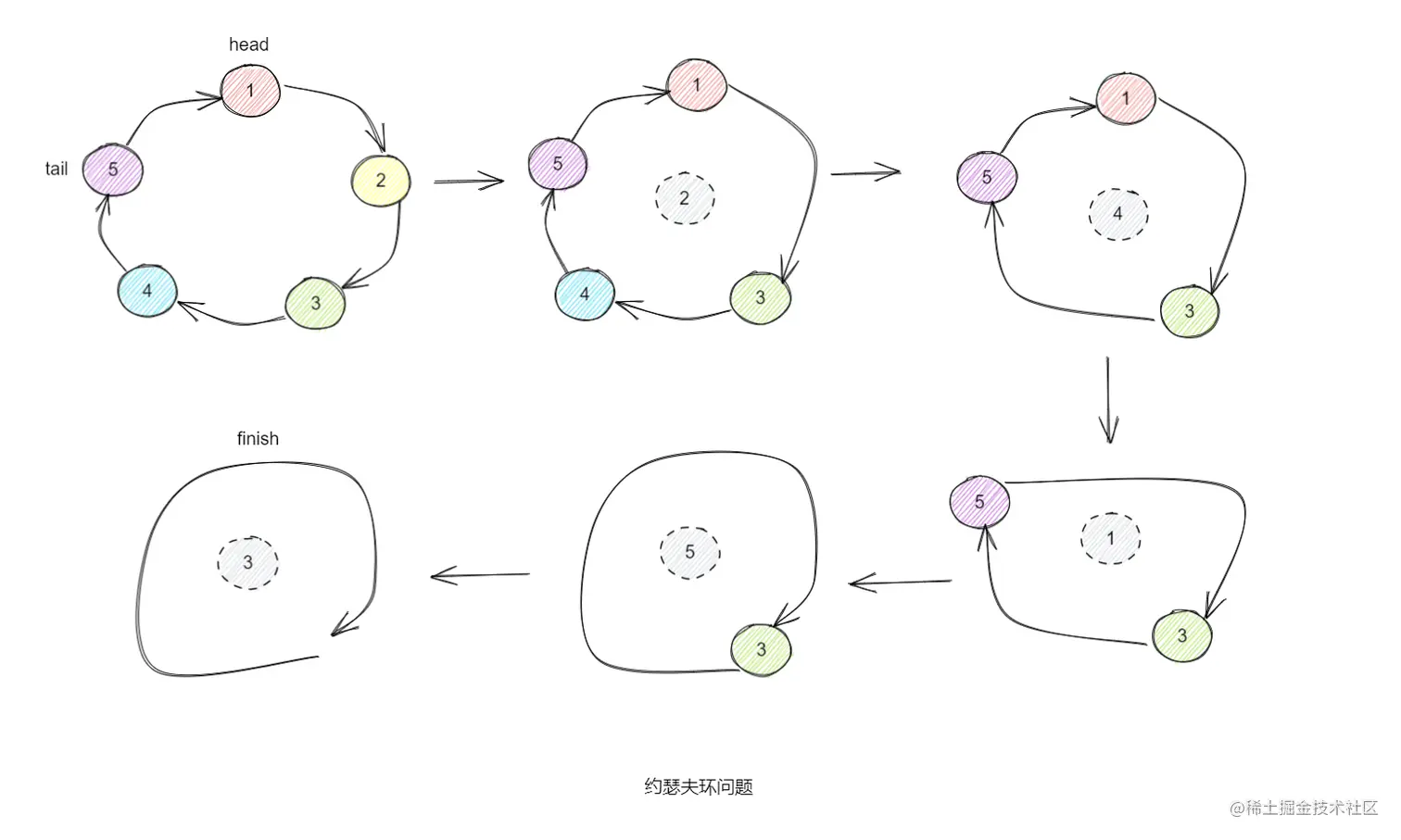 用一个不带头结点的循环链表来处理 Josephus 问题:先构成一个有 n 个结点的单循环链表,然后由 k 结点起从 1 开始计数,计到 m 时,对应结点从链表中删除,然后再从被删除结点的下一个结点又从 1 开始计数,直到最后一个结点从链表中删除算法结束。