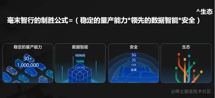 依照渐进式路线,毫末一步步稳扎稳打,发布了“五大制胜法则”以及一条“制胜公式”。“五大制胜法则”提出了要将智能驾驶产品开发,始终将安全放在首位、加强产品体验等切实可行的发展方向,帮助毫末打赢智能驾驶下半场。而“一条制胜公式”则是用领先的数据智能体系乘以稳定量产能力,乘以安全,再叠加生态的幂次方,打造了“毫末模式”。