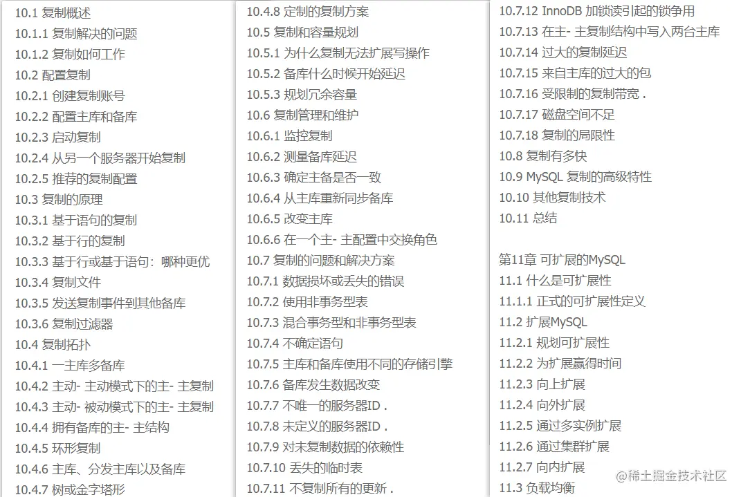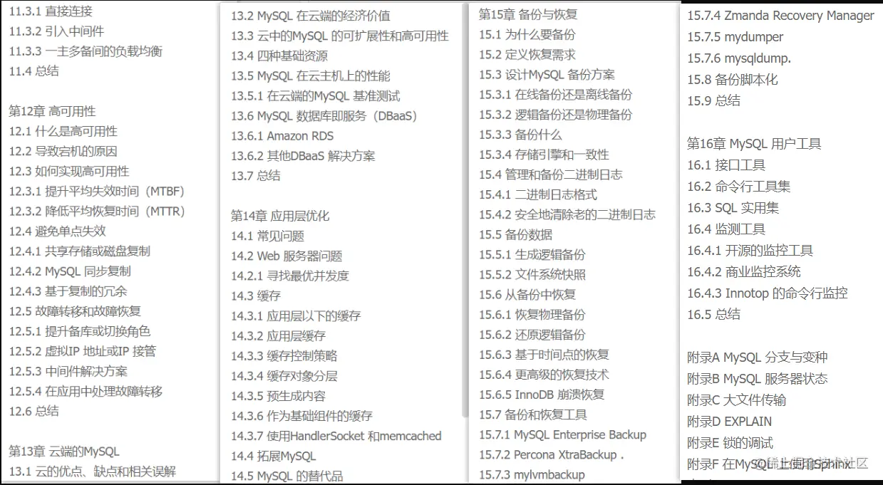 由于篇幅限制,我也不可能把整本书展示出来,大家看看目录就懂了,这本书绝对是非常适合拿来学习MySQL的,里面有大量实际案例供大家学习,有需要的朋友可以看我主页的公司昵称
