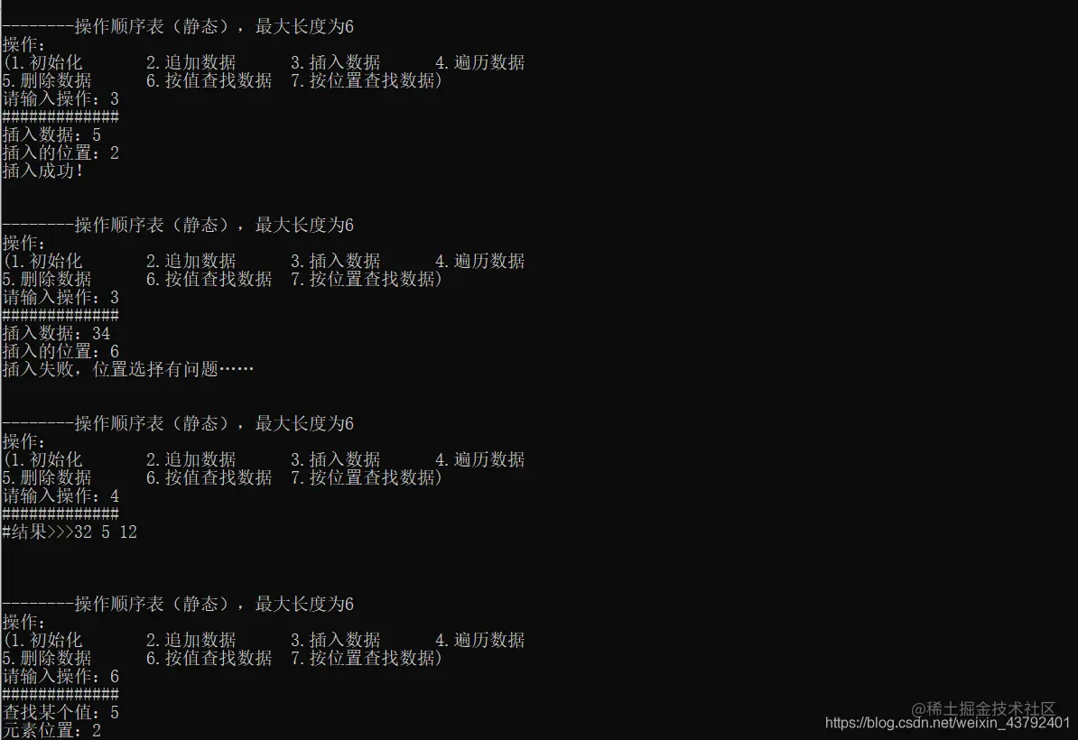 printf("\n\n--------操作顺序表(静态),最大长度为%d\n",MAXSIZE);