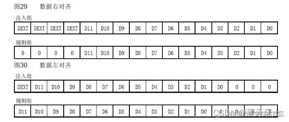 由于ADC获得的数据是12位精度的,而数据存储在16位数据寄存器中,因此ADC的存储结果能够分为左对齐或右对齐方式(12位),如下表所示: