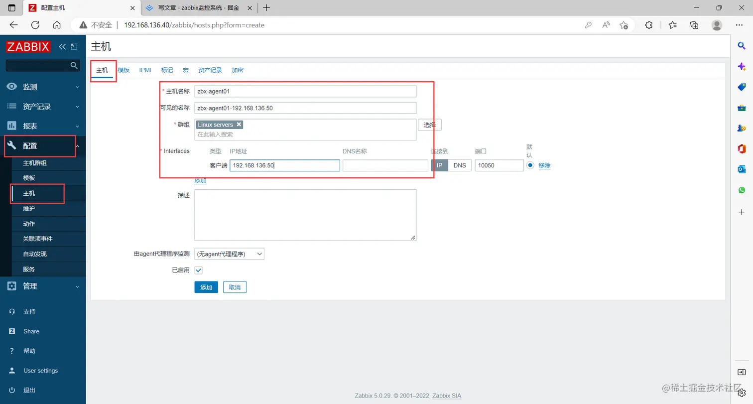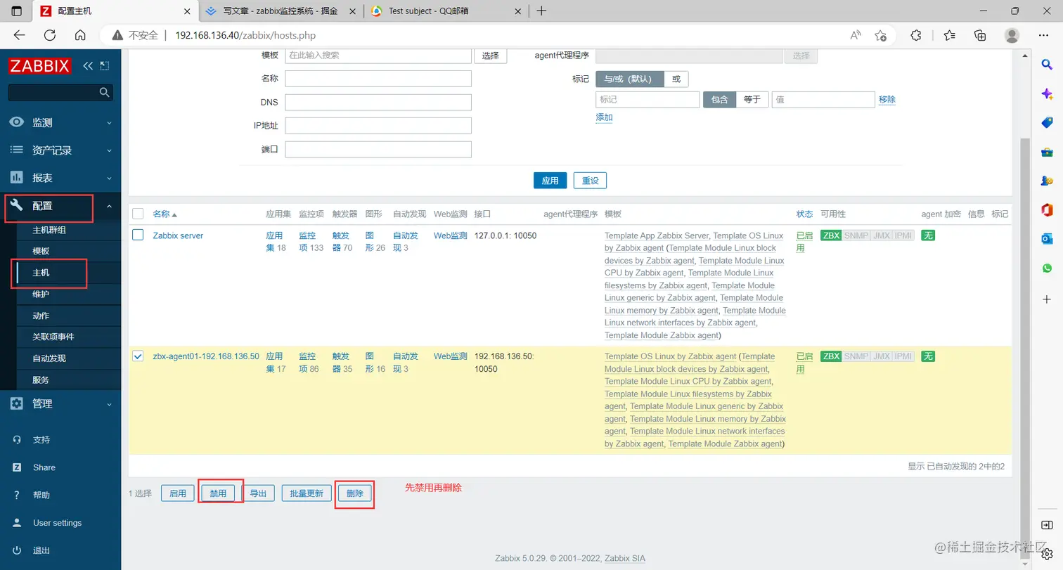 点击左边菜单栏【配置】中的【主机】,勾选原有的客户端主机,点击 删除