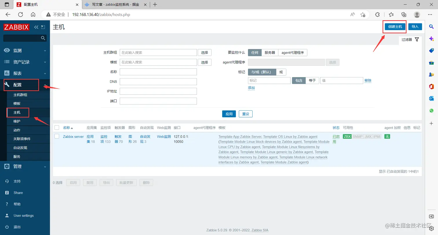 点击左边菜单栏【配置】中的【主机】刷新,等待一段时间后即可刷新出自动发现的客户端主机