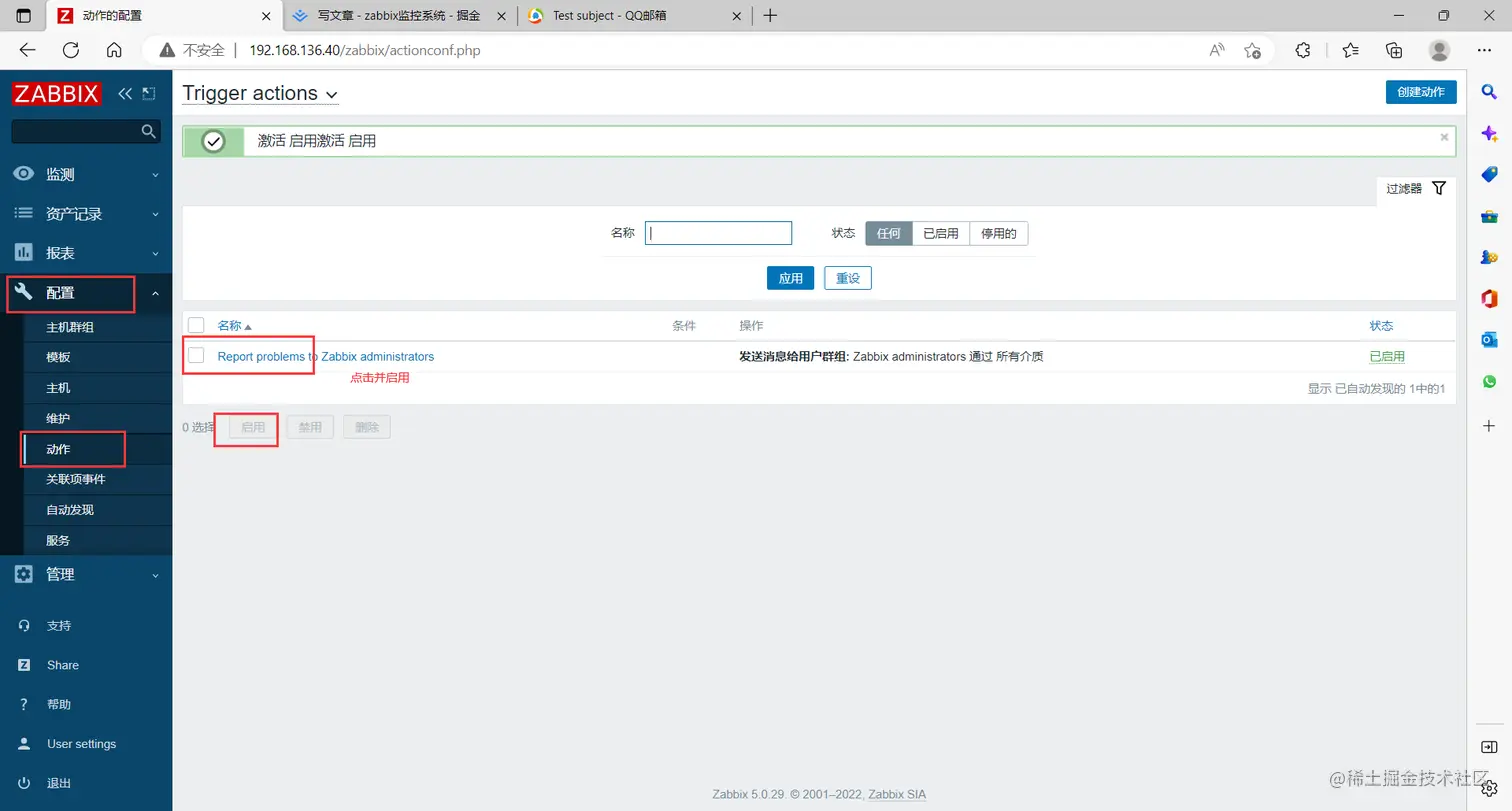 点击左边菜单栏【配置】中的【动作】,勾选自动注册规则,点击 禁用