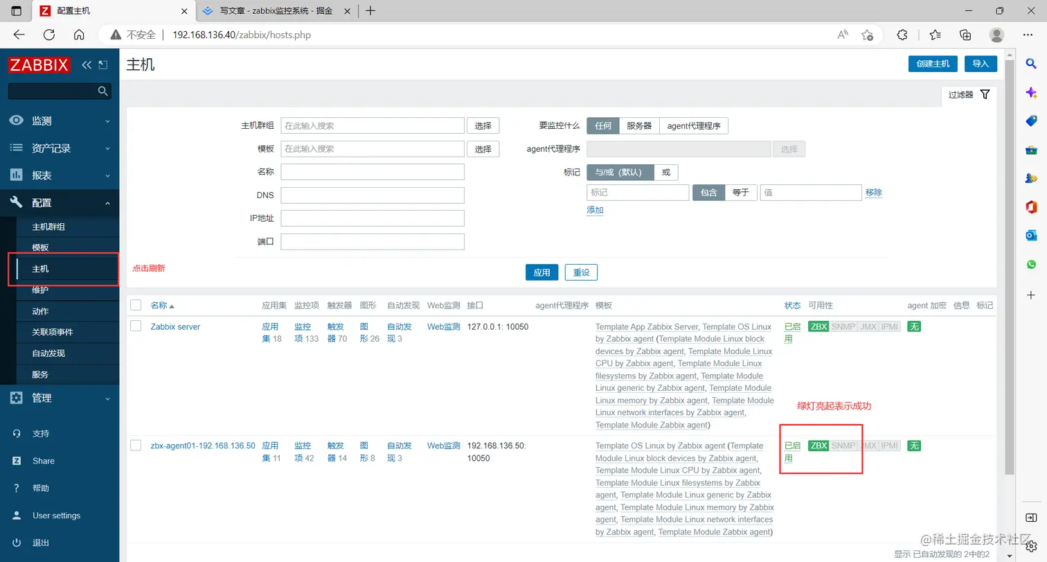点击左边菜单栏【配置】中的【主机】刷新,查看客户端主机监控状态正常