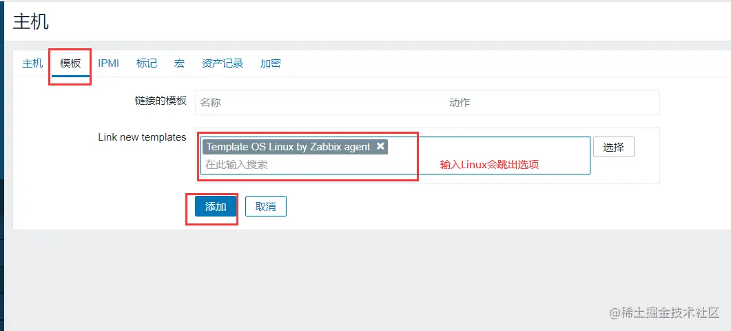 再点击【添加】,【操作类型】选择 与模板关联,【模板】搜索 Linux,选择 Template OS Linux by Zabbix agent,点击 【add】