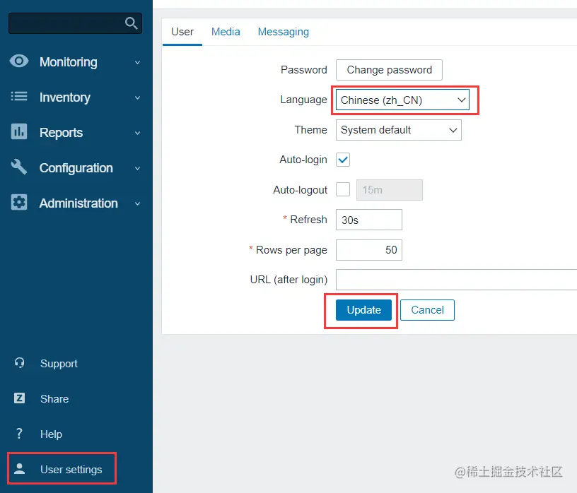 设置文件界面:点击左边菜单栏的【User settings】,【Language】选择 Chinese(zh_CN),再点击 Update 更新。