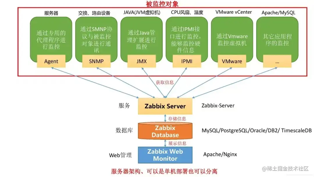 (1) zabbix server: zabbix 服务端守护进程,其中zabbix_agent、 zabbix_ get、zabbix_sender、 zabbix_proxy的数据最终都提交给zabbix server;