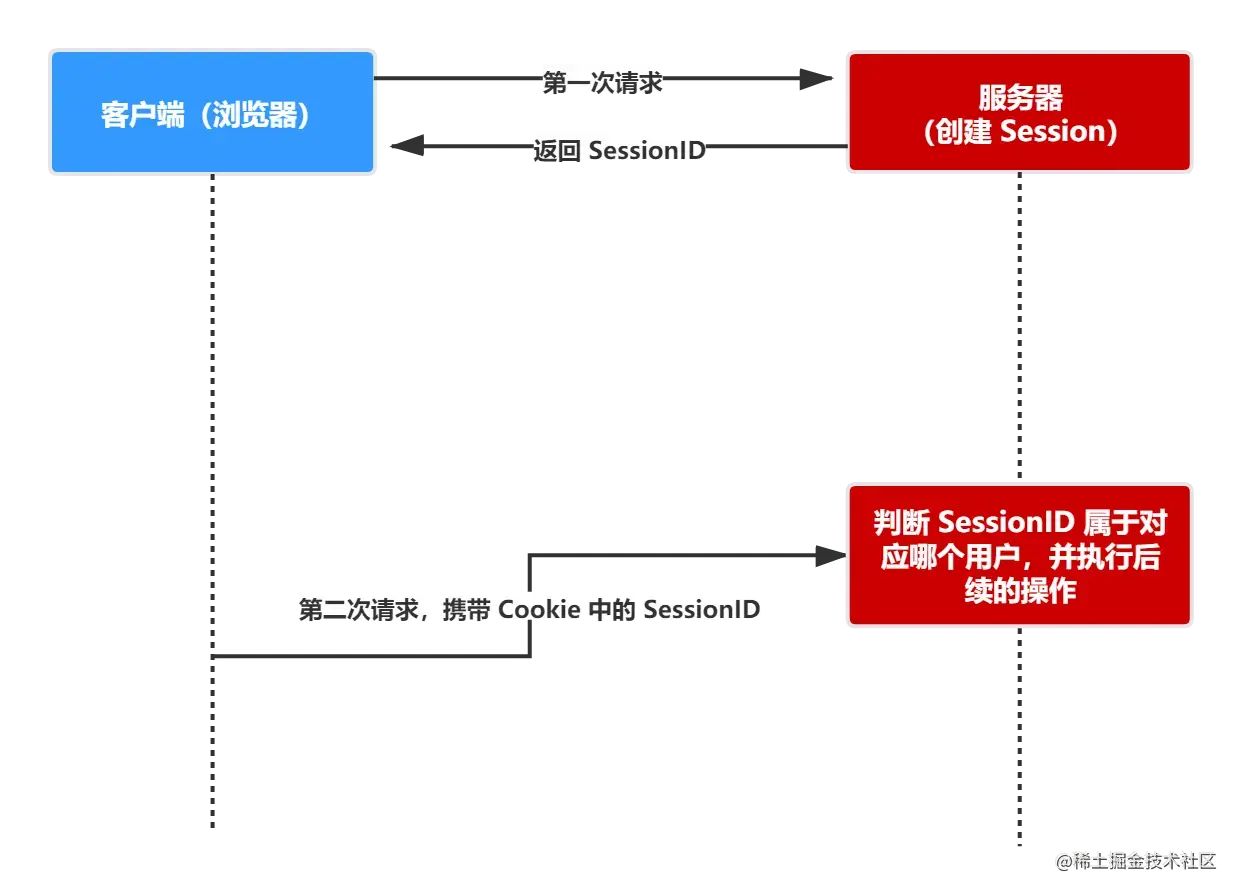 - cookie 存储在客户端: cookie 是服务器发送到用户浏览器并保存在本地的一小块数据,它会在浏览器下次向同一服务器再发起请求时被携带并发送到服务器上。