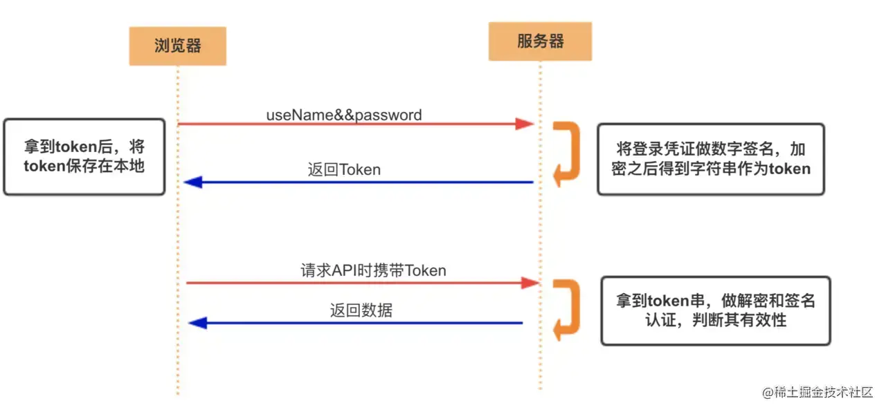 - 在互联网应用中,一般网站(如掘金)会有两种模式,游客模式和登录模式。游客模式下,可以正常浏览网站上面的文章,一旦想要点赞/收藏/分享文章,就需要登录或者注册账号。当用户登录成功后,服务器会给该用户使用的浏览器颁发一个令牌(token),这个令牌用来表明你的身份,每次浏览器发送请求时会带上这个令牌,就可以使用游客模式下无法使用的功能。