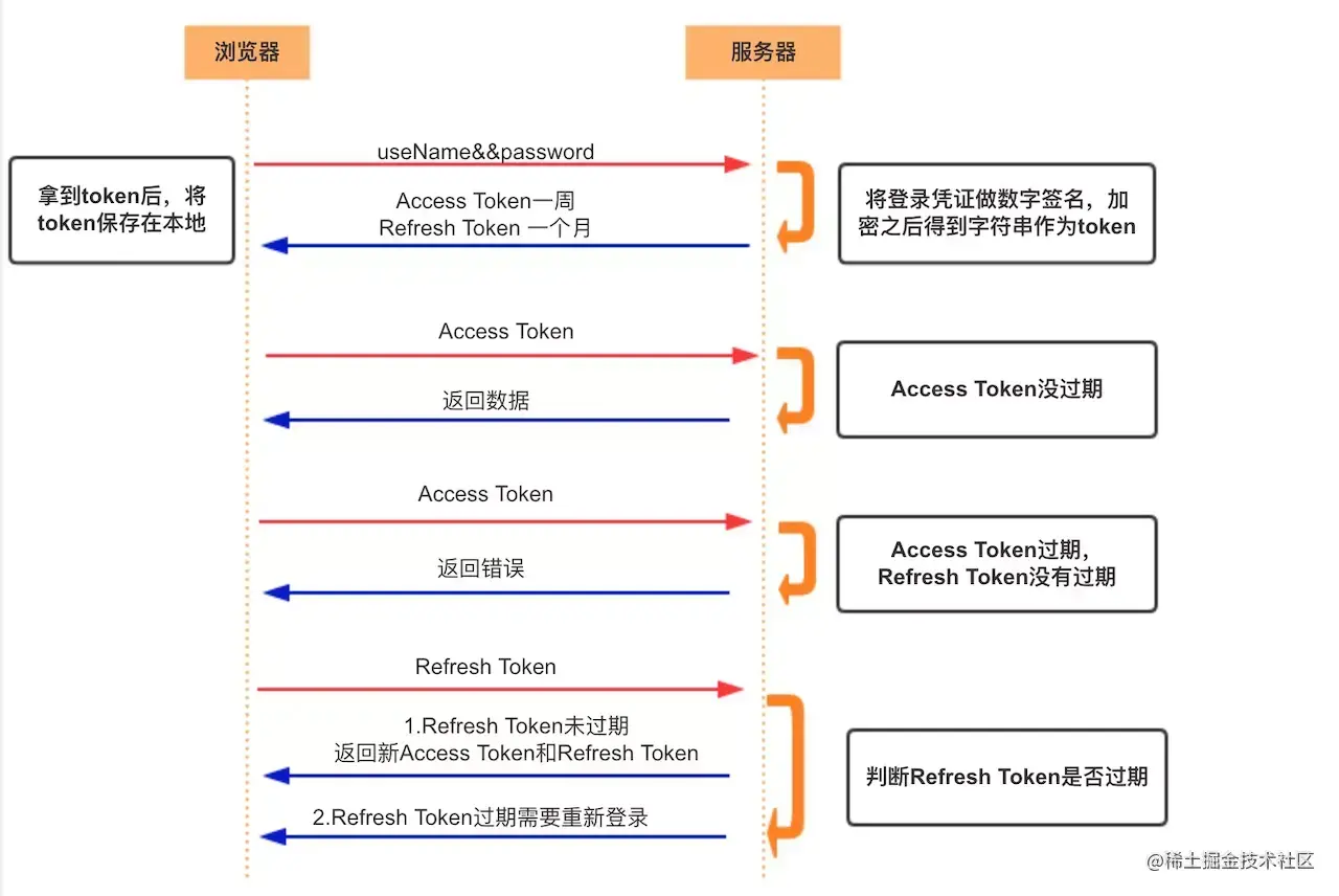 - Access Token 的有效期比较短,当 Acesss Token 由于过期而失效时,使用 Refresh Token 就可以获取到新的 Token,如果 Refresh Token 也失效了,用户就只能重新登录了。