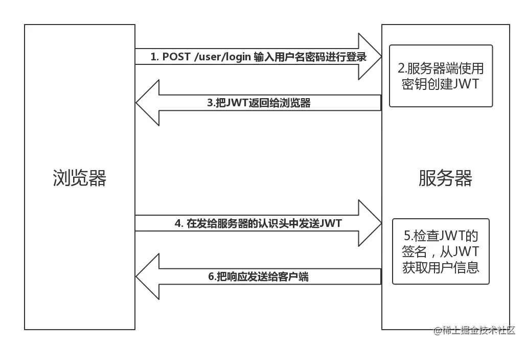- 服务端的保护路由将会检查请求头 Authorization 中的 JWT 信息,如果合法,则允许用户的行为