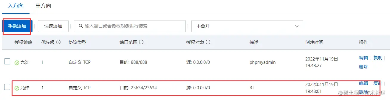- 进入后,点击手动添加即可。阿里云默认给我们添加了几个端口,这里可以把需要用的端口一起添加上