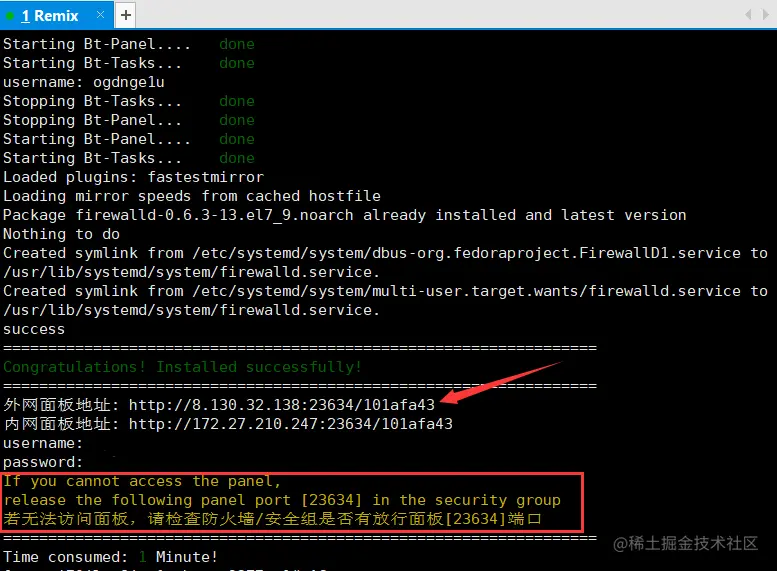 返回XShell,复制脚本命令运行。然后就是一路yes下来,安装完会给你一个默认账号和宝塔管理网址。