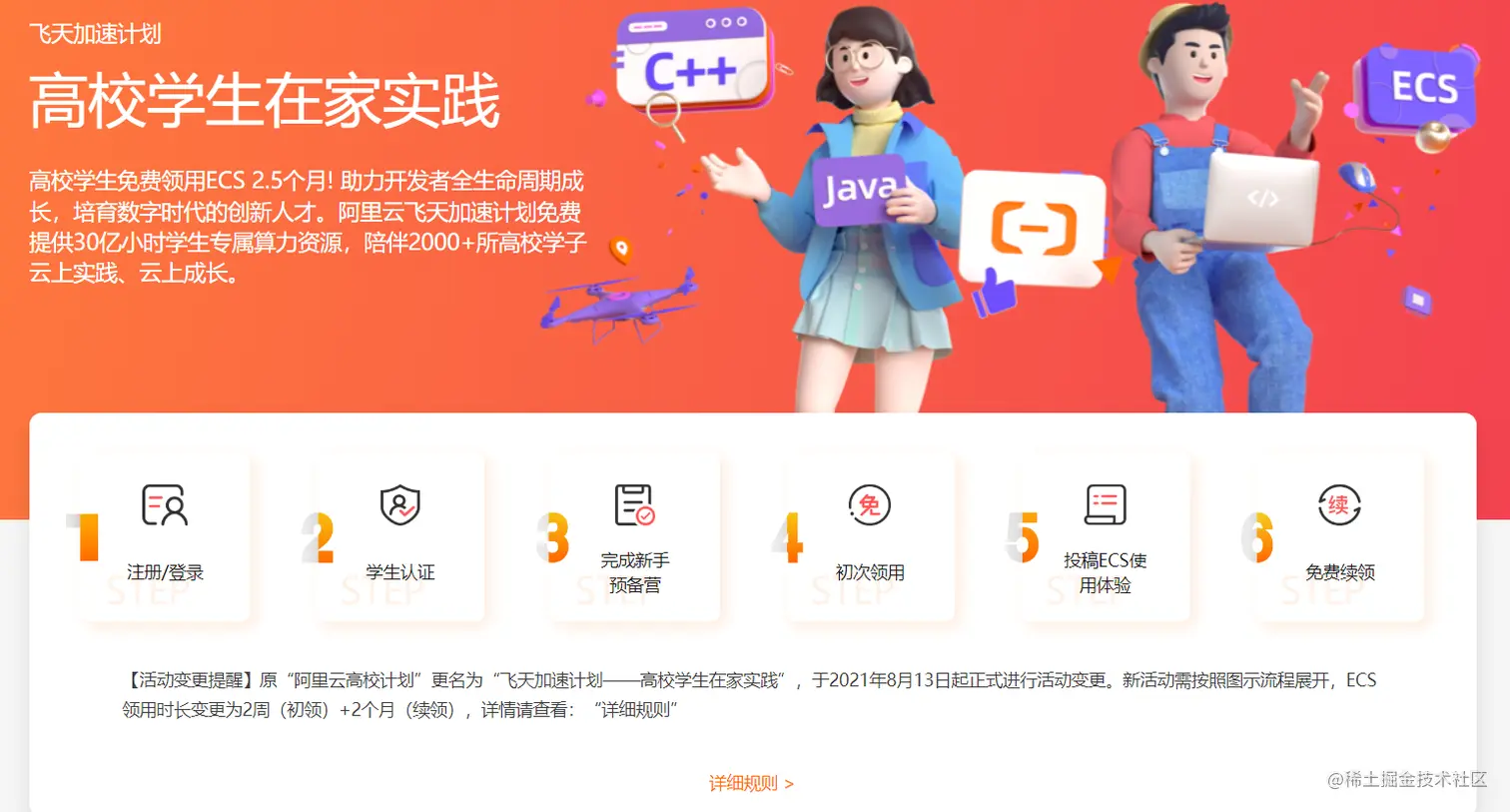 这里是阿里云学生活动页面,也可以在阿里云首页搜索“学生机”,也可以找到活动页面。