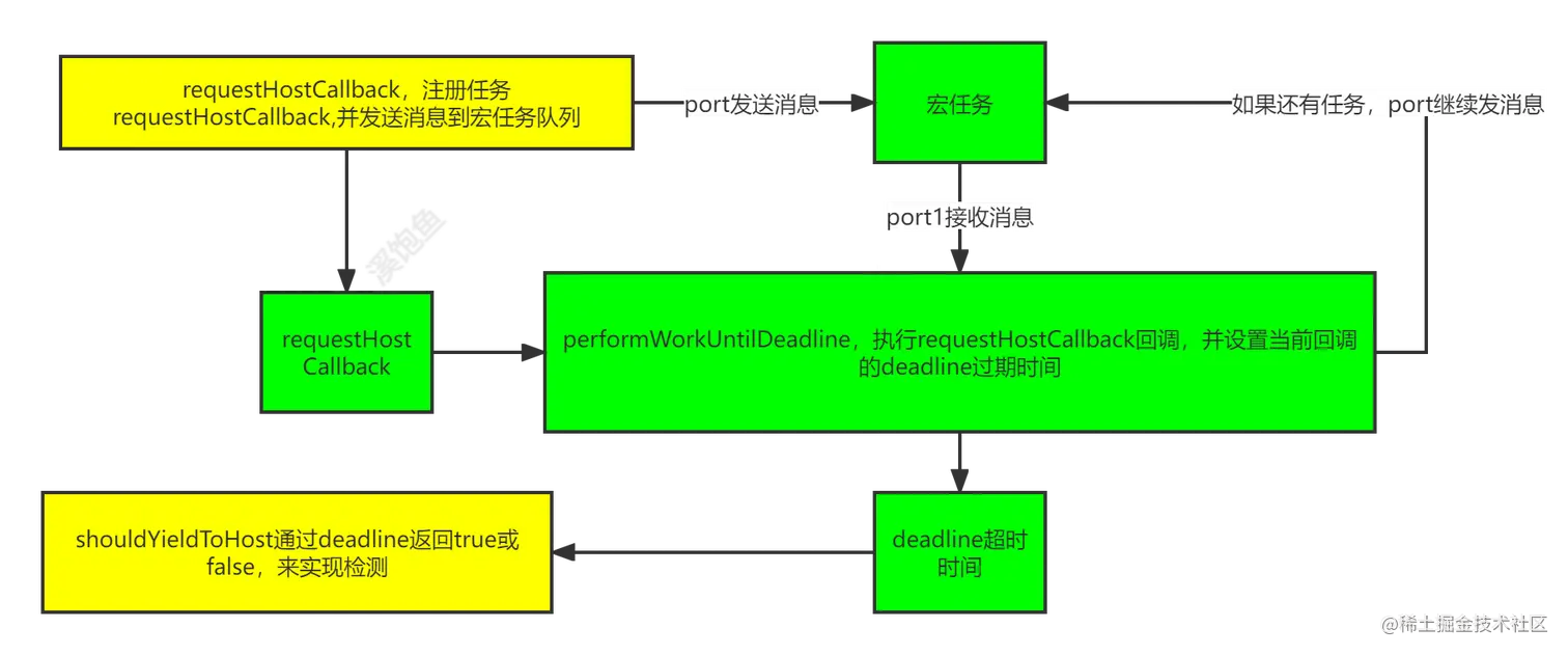 调度:通过MessageChannel建立通道,然后2个端口一个发消息一个接消息,我们抛出发消息的事件,当接到消息的时候我们就可以设置空闲时间deadline,yieldInterval是默认5ms的,同时也执行回调函数。