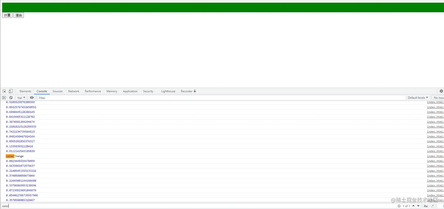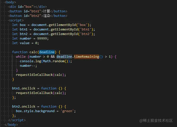 紧接着看第二段代码,给他加上requestdleCallback就可以在用户点击的时候把当前计算任务暂停,然后去执行把背景颜色变为绿色的这个操作。