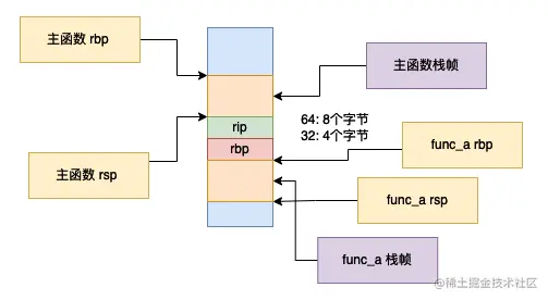 恢复主函数的 rbp 寄存器的值很好理解,因为我们只需要通过内嵌函数直接得到即可,但是主函数的 rsp 寄存器的值可能有一点复杂,s首先我们需要知道,主函数和 func_a 的两个与栈帧有关的寄存器的指向,他们的指向如下图所示: