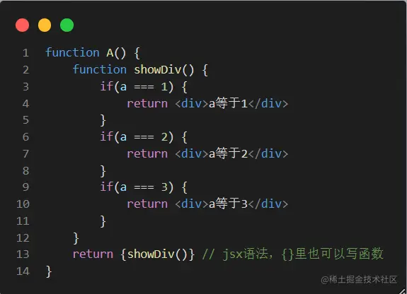 掌握React100问 进度条:13~15 前端搅屎棍 2022-11-19 58 阅读1分钟 13. 想满足变量a等于2时才展示div要怎么写? 猜一猜div里的a是变量还是字符串? 字符串,因为当外层有html标签时,只有用{}包起来才算变量,如: 14.条件很多时,怎么分别展示不同div?