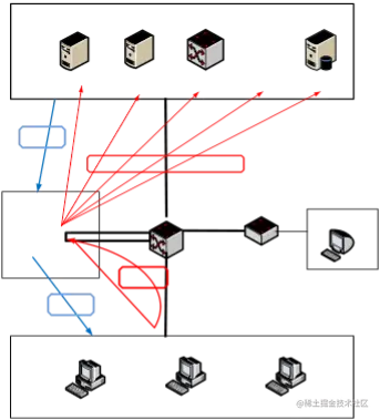 - 核心交换区:由支持虚拟交换的高性能交换机组成。负责整个云计算系统内部之间、内部与外部之间的通信交换;