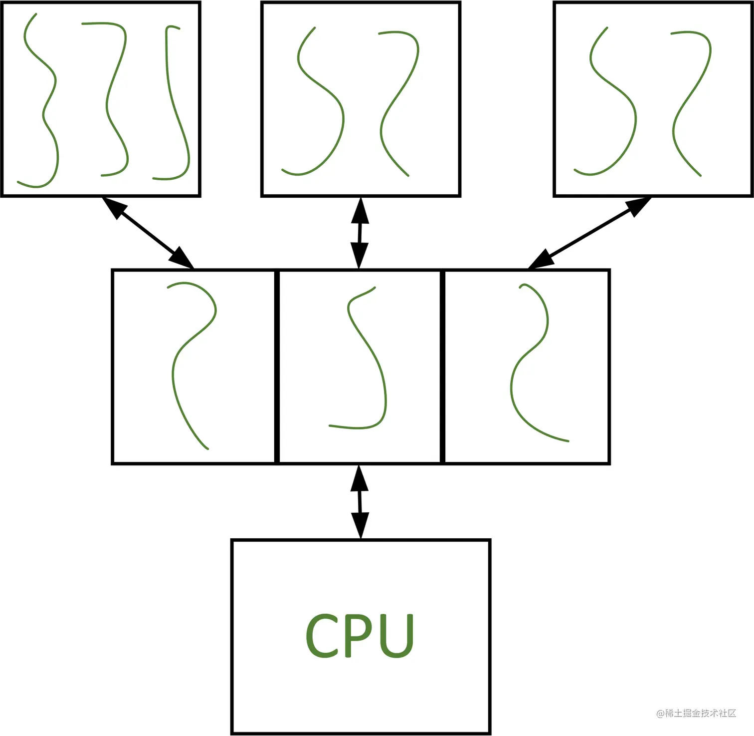 首先,我们要弄清楚这张图的意思。图的最上层显示了3个盒子,代表内存中的3个不同的进程,第一个进程在它的地址空间中有3个用户线程,第二个进程有2个,以此类推。图的第二层显示的是内核,每个用户级进程都被映射到内核空间(为什么?我们等会就知道了)中的一个内核线程,这是用箭头指定的,在底层我们有CPU。